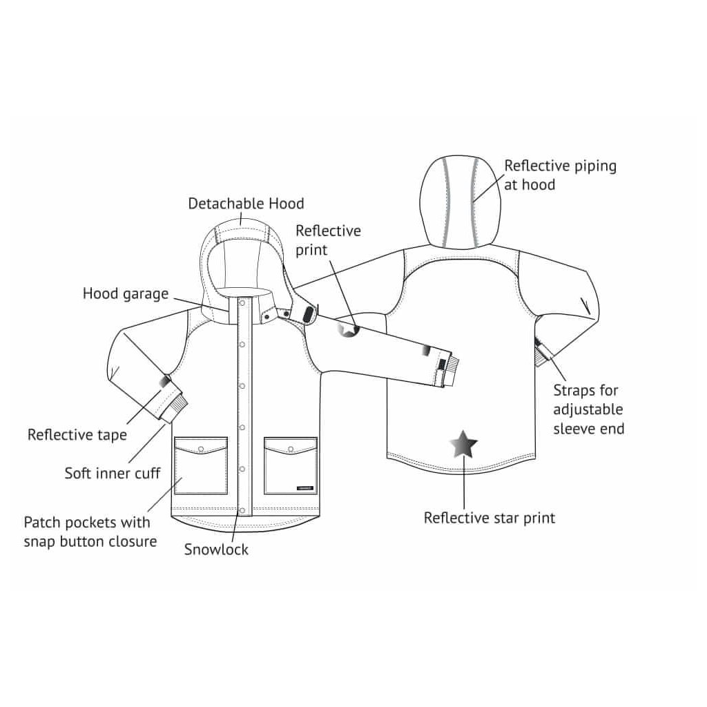 Die Jacke hat eine abnehmbare Kapuze, die vor Wind und Schnee schützt, und verstellbare Ärmelenden mit Schneefang (Snow Stop), die das Eindringen von Schnee in die Ärmel verhindern. Reflektierende Streifen an den Ärmeln und ein reflektierender Stern auf dem Rücken erhöhen die Sichtbarkeit des Kindes in der Dämmerung oder bei schlechten Sichtverhältnissen.